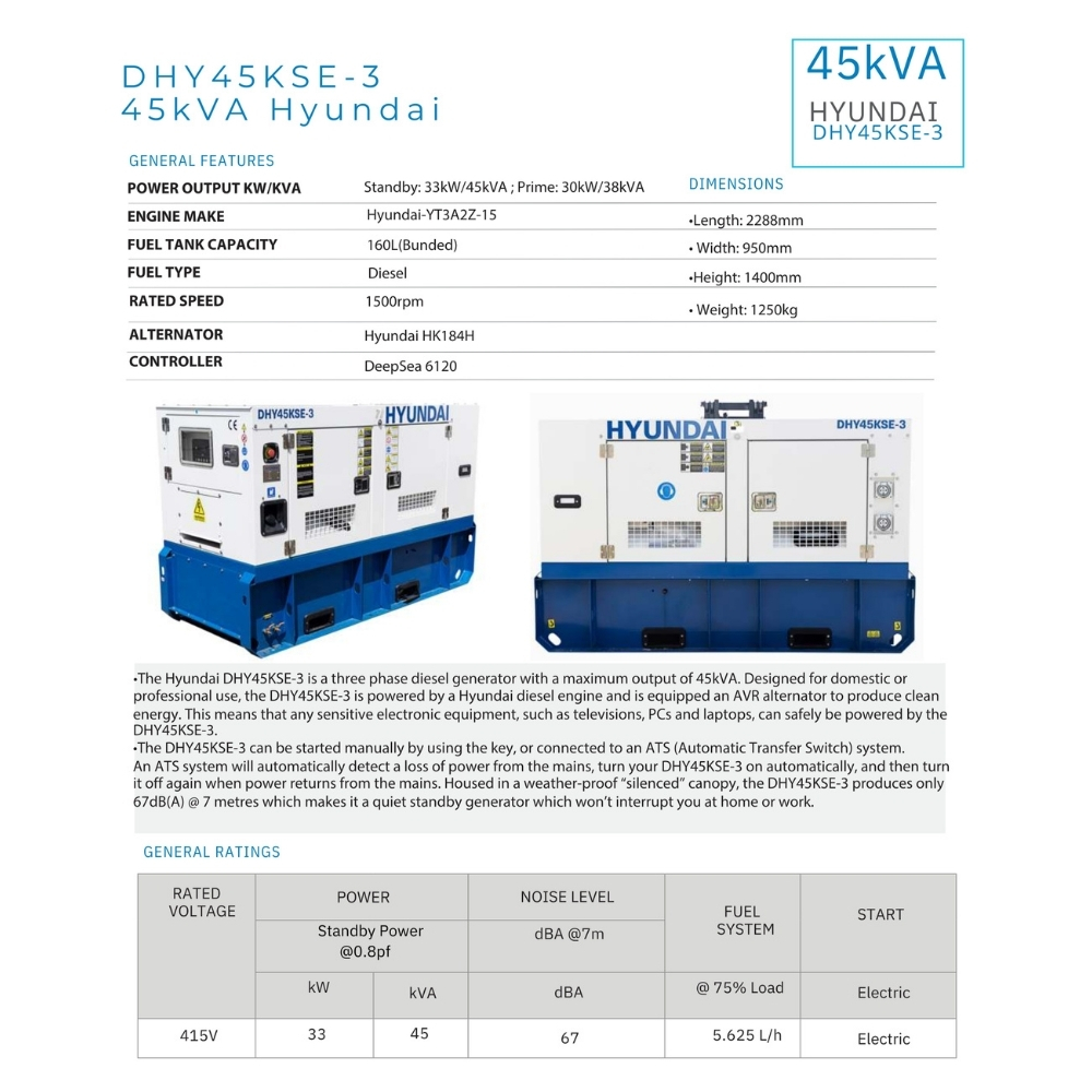 The Hyundai DHY45KSE is a three phase diesel generator with a maximum output of 33kW/45kVA. Designed for domestic or professional use, the DHY45KSE is powered by a 35hp 1500rpm diesel engine and is equipped an AVR alternator to produce clean energy. This means that any sensitive electronic equipment, such as televisions, PCs and laptops, can safely be powered by the DHY45KSE.