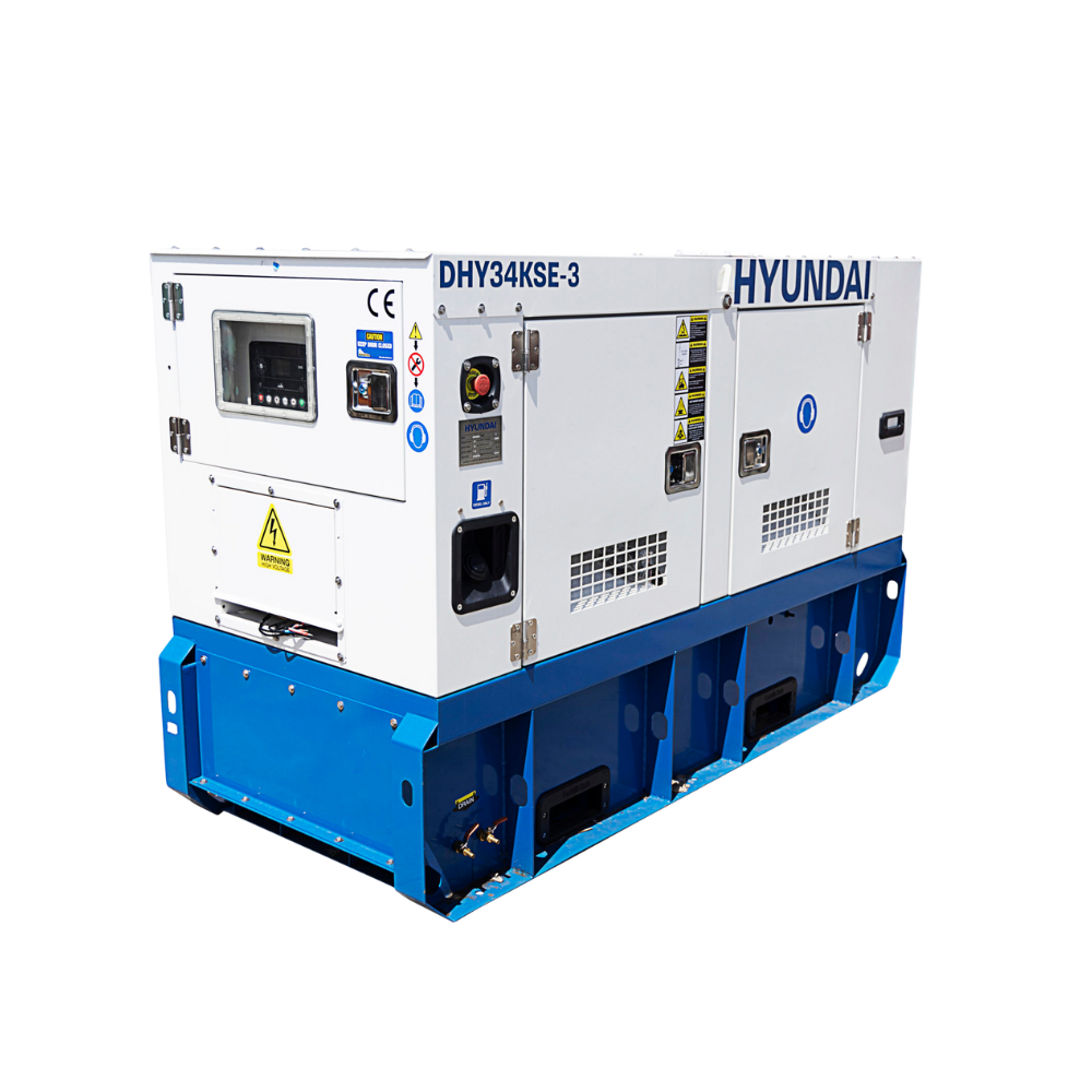 SKU: DHY34KSE The Hyundai DHY34KSE is a three phase diesel generator with a maximum output of 34kVA. Designed for domestic or professional use, the DHY34KSE is powered by a HY4102 diesel engine and is equipped an AVR alternator to produce clean energy. This means that any sensitive electronic equipment, such as televisions, PCs and laptops, can safely be powered by the DHY34KSE. Product Description – 34kVA Hyundai DHY34KSE The DHY34KSE can be started manually by using the key, or connected to an ATS (Automatic Transfer Switch) system. An ATS system will automatically detect a loss of power from the mains, turn your DHY34KSE on automatically, and then turn it off again when power returns from the mains. Housed in a weather-proof silenced canopy, the DHY34KSE produces only 65dB @ 7 metres which makes it a quiet standby generator which won’t interrupt you at home or work. All Hyundai 1500rpm diesel generator sound proof canopies undergo an anti-corrosion painting process called electrophoretic painting. This process ensures all areas of the canopy have an evenly applied thickness of paint, ensuring maximum corrosion protection. The DHY34KSE benefits from being an economical diesel generator, capable of running on red diesel which is significantly cheaper than road diesel and is safer to store than petrol. Fitted with an MRS 10 control panel interface as standard, its user friendly interface gives fingertip control over several operating parameters as well as providing information statistics relating to engine, output and generator running parameters. Running at 1500rpm, the engine is stressed less than in 3000rpm generators and this helps extend the lifespan of the machine if properly serviced. Product Specifications Model DHY34KSE Engine Hyundai HY4102 Diesel Engine Standby Power Output 34 kVA/ 28 kW Prime Power Output 31 kVA/ 25 kW Fuel Tank Capacity 93 litres Dimensions 220 x 95 x 124 cm Weight 970 kg