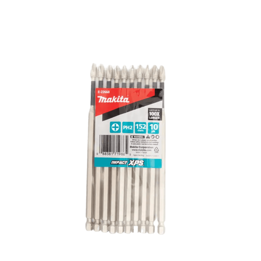 Product Details The Makita Power Bit Impact XPS PH2 x 150mm is engineered to deliver exceptional durability and performance, lasting up to 100 times longer than standard bits. This makes it an ideal and reliable choice for a wide range of demanding tasks. The precision-machined tips are designed to ensure a full-contact fit, which significantly improves holding power and extends the lifespan of the tool. This feature is particularly beneficial for high-performance impact applications, where precision and reliability are crucial. The bit is equipped with torsion power rings, which are specifically designed to enhance the transfer of impact force. This not only reduces stress on the bit but also increases efficiency during use, making it a valuable tool for professionals. The unique carbon alloy steel blend from which the bit is crafted allows it to flex under pressure, providing greater resilience and longevity. This flexibility is a key factor in the bit’s ability to withstand the rigors of heavy-duty use. For even better fastening control, the bit can be paired with the Mag Boost Adapter. This adapter enhances the magnetic holding power of fasteners, ensuring that they remain securely in place during use. Whether you are tackling professional construction projects or engaging in heavy-duty repairs, this 10-pack of power bits offers consistency, strength, and superior performance. The combination of these features makes the Makita Power Bit Impact XPS PH2 x 150mm an indispensable tool for any professional toolkit. Last up to 100 x longer compared to standard bits Precision machined tips with a full contact fit for improved holding power & longer life Torsion power Rings for better transfer of Impact power Unique carbon alloy steel blend flexes for longer life Add the Mag Boost Adapter to the tip for greater magnetic holding power of the fastener