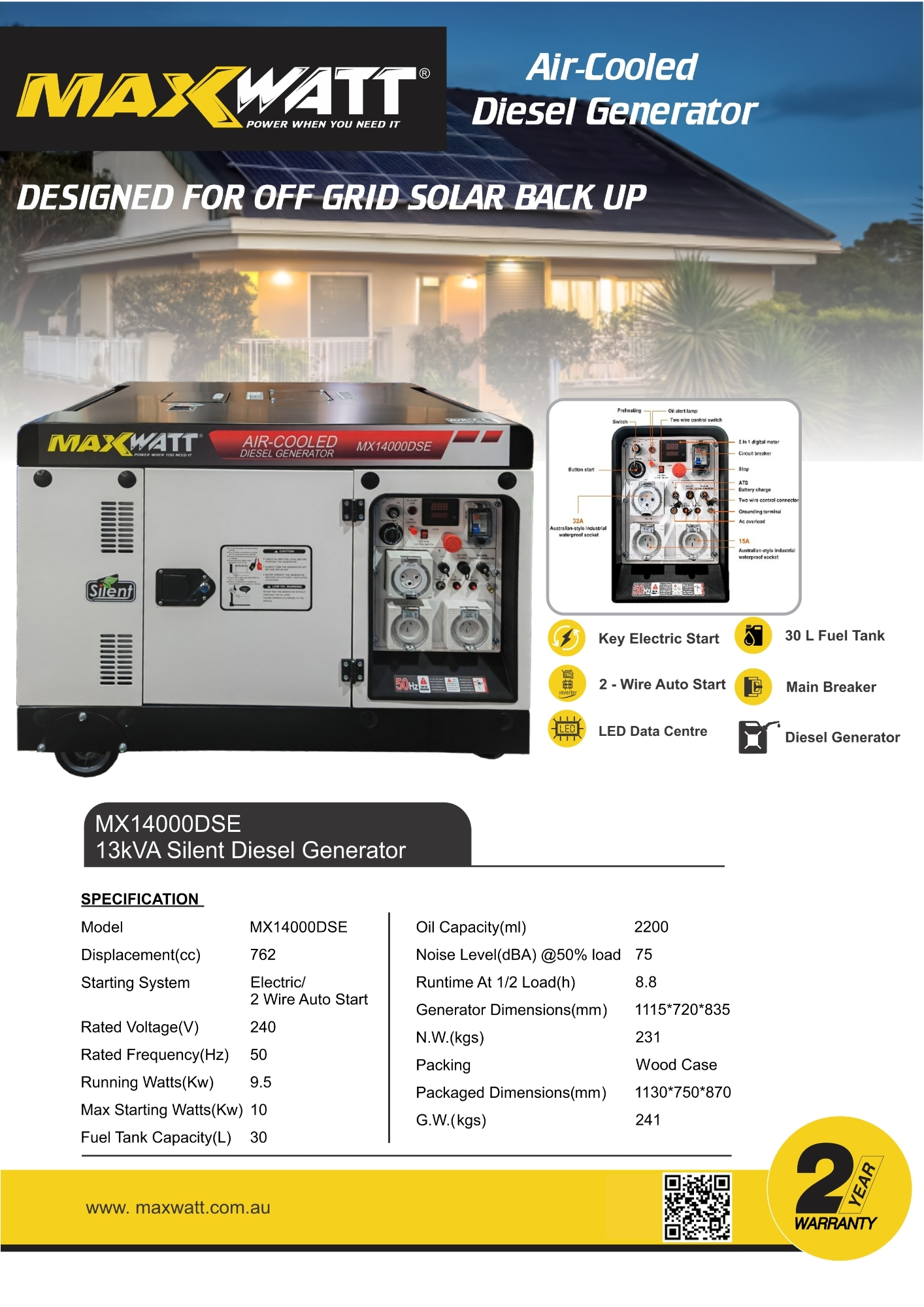 MaxWatt 13kVA/10000W Diesel Generator with Electric Start, 2 Year Warranty. Maxwatt® diesel generators offer the best in portable power, fuel efficiency and are super silent. Besides the electrical output being able to power all sensitive equipment, the MX140000DSE is perfect for home use as a backup power supply. This generator has a rated output of 10000 watts with a maximum output of 9500 watts.