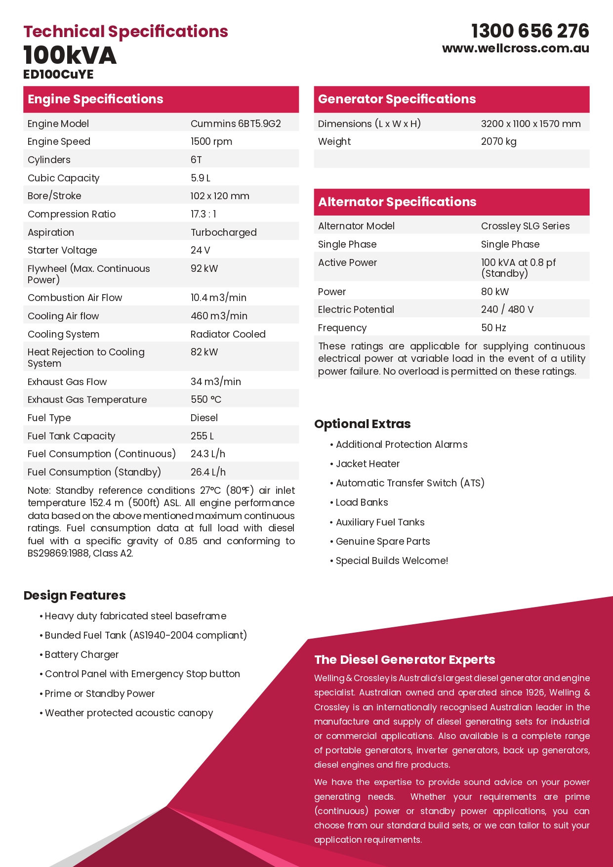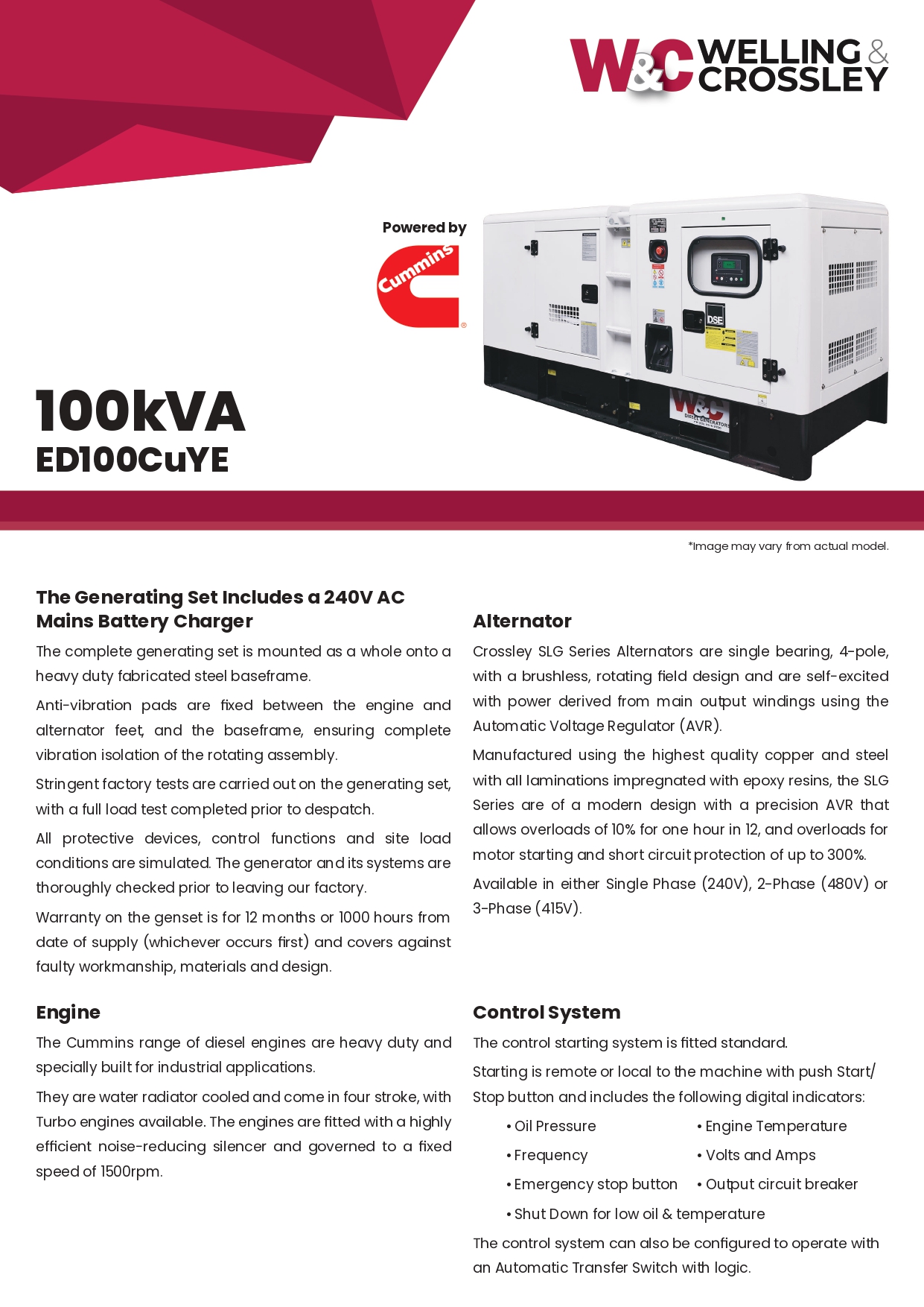 100kVA, Single Phase, Standby Diesel Generator with Cummins Engine in Canopy Model No.: ED100CUYE The Cummins powered ED100CUYE is a 100kVA single phase standby diesel generator. Complete with Crossley SLG series single bearing, 4-pole, brushless alternator, remote start/stop control system, 255 litre fuel tank, weather protective acoustic canopy and Cummins engine. Welling & Crossley Cummins powered generating sets are fully integrated power generation systems that are stringently tested to provide optimum performance, reliability, and versatility for standby applications. Alternator Alternator Model: Crossley SLG Series Electric Power: Single Phase Active Rating: 100 kVA at 0.8 pf (Standby) Power: 80 kW Voltage: 240 / 480V Frequency: 50Hz Engine Engine Model: Cummins 6BT5.9G2 Engine Speed: 1500 rpm Cylinder No.: 6T Cubic Capacity: 5.9 L Bore / Stroke: 102 x 120 mm Compression Ratio: 17.3 : 1 Aspiration: Turbocharged Starter Voltage: 24V Flywheel ( Max. Continuous Power): 92 kW Combustion Air Flow: 10.4 m³/min Cooling Air Flow: 460 m³/min Cooling System: Radiator Cooled Heat Rejection to Cooling System: 82 kW Exhaust Gas Flow: 34 m³/min Exhaust Gas Temperature: 550°C Fuel Type: Diesel Fuel Tank Capacity: 255 L Approx. Fuel Consumption (Continuous): 24.3 L/hr Approx. Fuel Consumption (Standby): 26.4 L/hr Generator Dimensions (L x W x H): 3200 x 1100 x 1570 mm (L x W x H) Weight: 2070 kg *Specifications are subject to change without notice